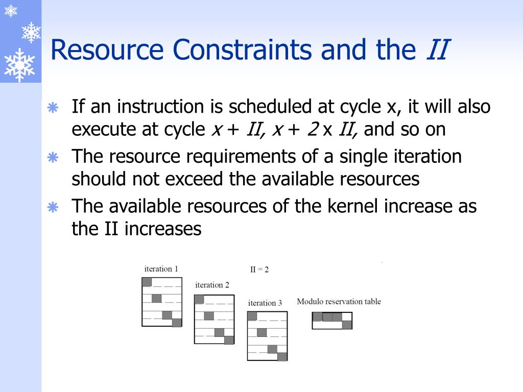 Resource Constraints and the II • If an instruction is scheduled at cycle x, it will also execute at cycle x + II, x + 2 x II, and so on • The resource requirements of a single iteration should not exceed the available resources • The available resources of the kernel increase as the II increases
