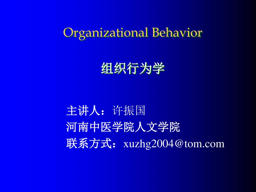 Organizational Behavior 组织行为学 主讲人:许振国 河南中医学院人文学院 联系方式:xuzhg2004@tom.com