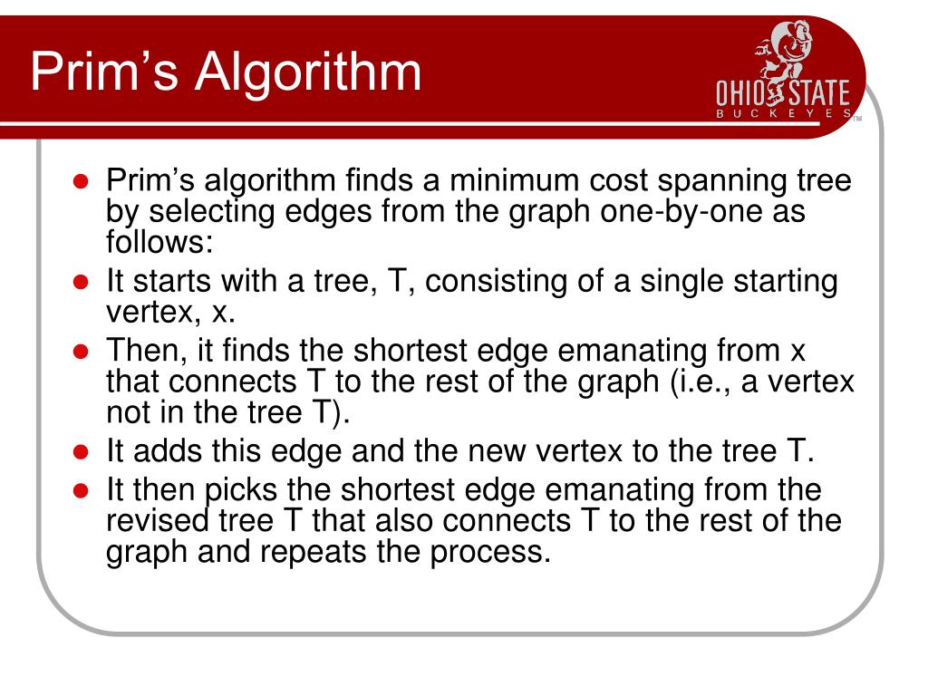 Prim’s Algorithm Abstract Consider a graph G=(V, E); Let T be a tree consisting of only the starting vertex x; while (T has fewer than I V I vertices) { find a smallest edge connecting T to G-T; add it to T; }