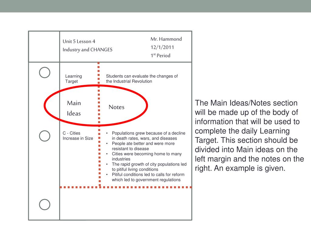 Mr. Hammond12/1/2011 1st Period Unit 5 Lesson 4Industry and CHANGES Students can evaluate the changes of the Industrial Revolution LearningTarget The Main Ideas/Notes section will be made up of the body of information that will be used to complete the daily Learning Target. This section should be divided into Main ideas on the left margin and the notes on the right. An example is given. MainIdeas Notes • C - Cities Increase in Size • Populations grew because of a decline in death rates, wars, and diseases • People ate better and were more resistant to disease • Cities were becoming home to many industries • The rapid growth of city populations led to pitiful living conditions • Pitiful conditions led to calls for reform which led to government regulations
