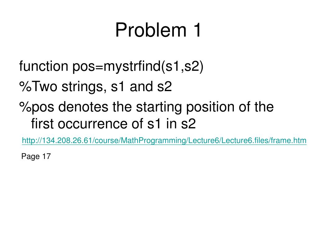 Problem 1 function pos=mystrfind(s1,s2) %Two strings, s1 and s2 %pos denotes the starting position of the first occurrence of s1 in s2 http://134.208.26.61/course/MathProgramming/Lecture6/Lecture6.files/frame.htm Page 17