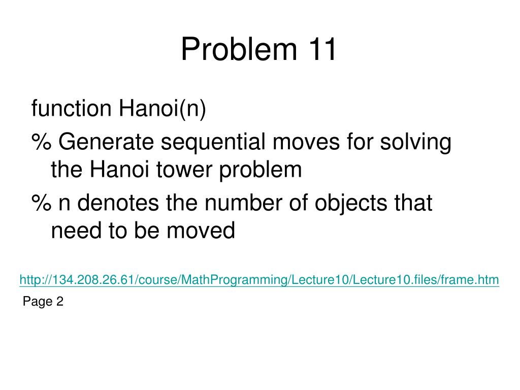 Problem 11 function Hanoi(n) % Generate sequential moves for solving the Hanoi tower problem % n denotes the number of objects that need to be moved http://134.208.26.61/course/MathProgramming/Lecture10/Lecture10.files/frame.htm Page 2
