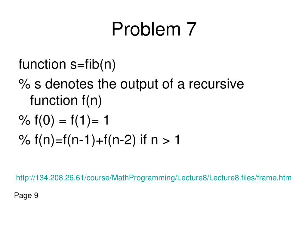 Problem 7 function s=fib(n) % s denotes the output of a recursive function f(n) % f(0) = f(1)= 1 % f(n)=f(n-1)+f(n-2) if n > 1 http://134.208.26.61/course/MathProgramming/Lecture8/Lecture8.files/frame.htm Page 9