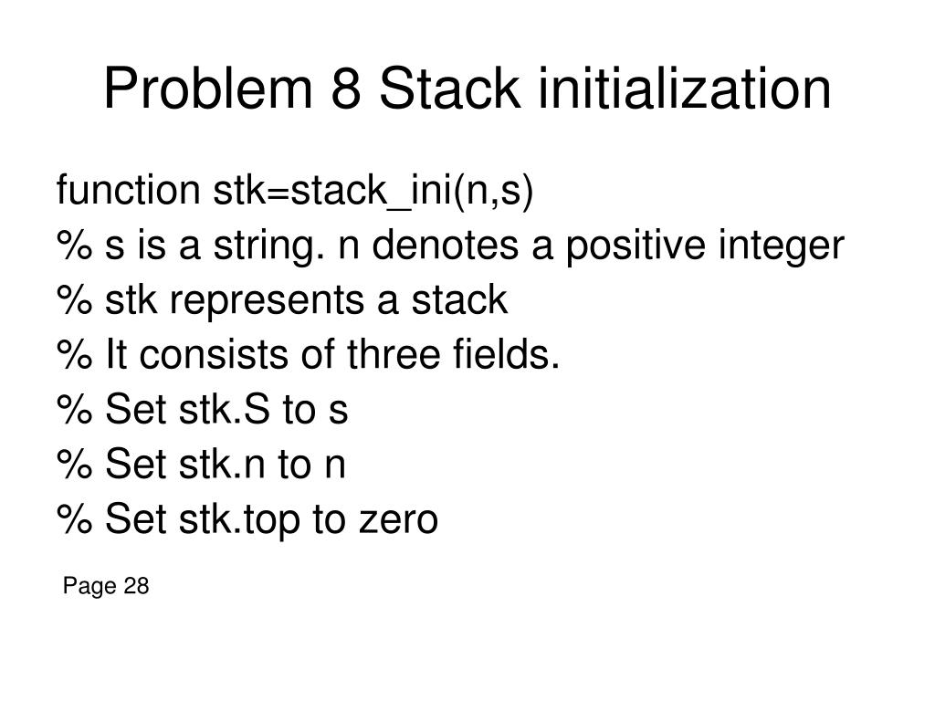 Problem 8 Stack initialization function stk=stack_ini(n,s) % s is a string. n denotes a positive integer % stk represents a stack % It consists of three fields. % Set stk.S to s % Set stk.n to n % Set stk.top to zero Page 28