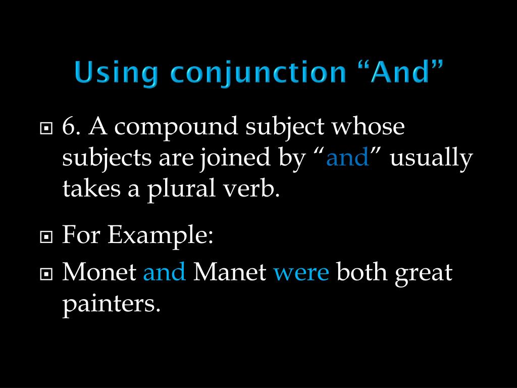 Using conjunction “And” • 6. A compound subject whose subjects are joined by “and” usually takes a plural verb. • For Example: • Monet andManetwere both great painters.