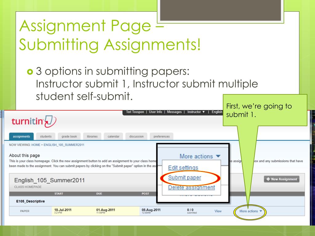 Assignment Page – Submitting Assignments! • 3 options in submitting papers:Instructor submit 1, Instructor submit multiplestudent self-submit. First, we’re going to submit 1.