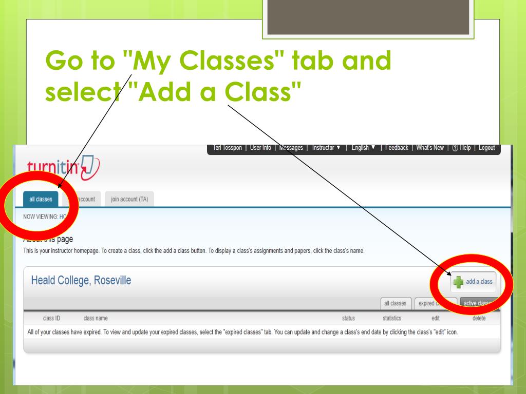 Turn It In.com. How-To. Login/Register. www.turnitin.com. Registration. USERNAME: 56573 PASSWORD: HCRose12. In the Create a New Account section, click on “Instructor”. Go to "My Classes" tab and select "Add a Class". Create a Class. Class type: Standard class