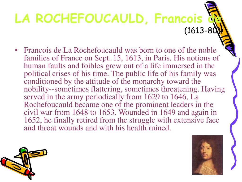 LA ROCHEFOUCAULD, Francois de (1613-80). • Francois de La Rochefoucauld was born to one of the noble families of France on Sept. 15, 1613, in Paris. His notions of human faults and foibles grew out of a life immersed in the political crises of his time. The public life of his family was conditioned by the attitude of the monarchy toward the nobility--sometimes flattering, sometimes threatening. Having served in the army periodically from 1629 to 1646, La Rochefoucauld became one of the prominent leaders in the civil war from 1648 to 1653. Wounded in 1649 and again in 1652, he finally retired from the struggle with extensive face and throat wounds and with his health ruined.
