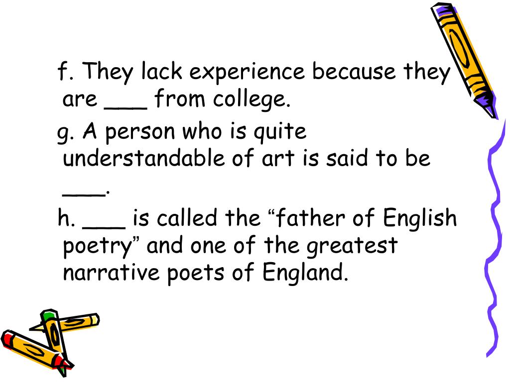 f. They lack experience because they are ___ from college. g. A person who is quite understandable of art is said to be ___. h. ___ is called the “father of English poetry” and one of the greatest narrative poets of England.