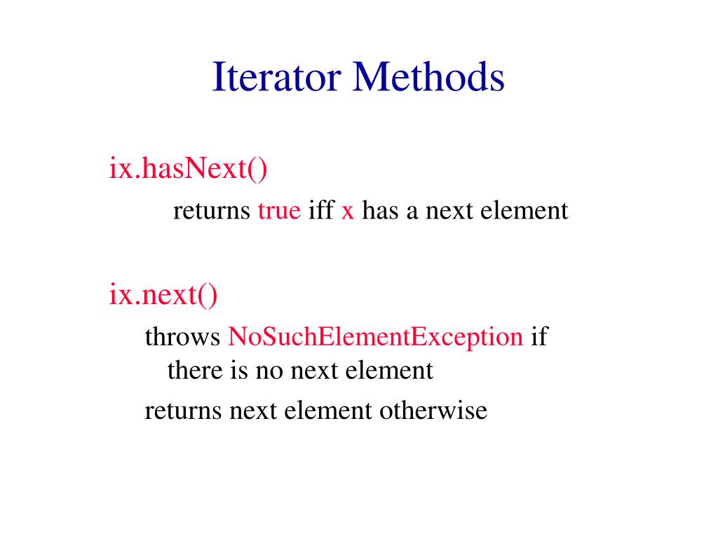 Iterator Methods ix.hasNext() returns true iff x has a next element ix.next() throws NoSuchElementException if there is no next element returns next element otherwise