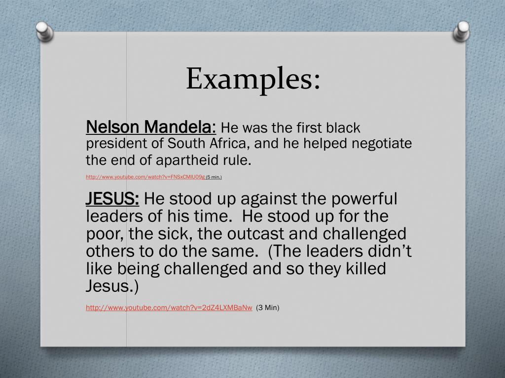 Examples: Nelson Mandela:He was the first black president of South Africa, and he helped negotiate the end of apartheid rule. http://www.youtube.com/watch?v=FNSxCMIU09g (5 min.) JESUS:He stood up against the powerful leaders of his time. He stood up for the poor, the sick, the outcast and challenged others to do the same. (The leaders didn’t like being challenged and so they killed Jesus.) http://www.youtube.com/watch?v=2dZ4LXMBaNw (3 Min)