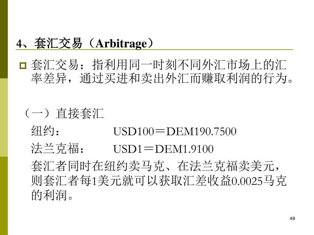 4、套汇交易(Arbitrage) • 套汇交易:指利用同一时刻不同外汇市场上的汇率差异,通过买进和卖出外汇而赚取利润的行为。 (一)直接套汇 纽约: USD100=DEM190.7500 法兰克福: USD1=DEM1.9100 套汇者同时在纽约卖马克、在法兰克福卖美元,则套汇者每1美元就可以获取汇差收益0.0025马克的利润。