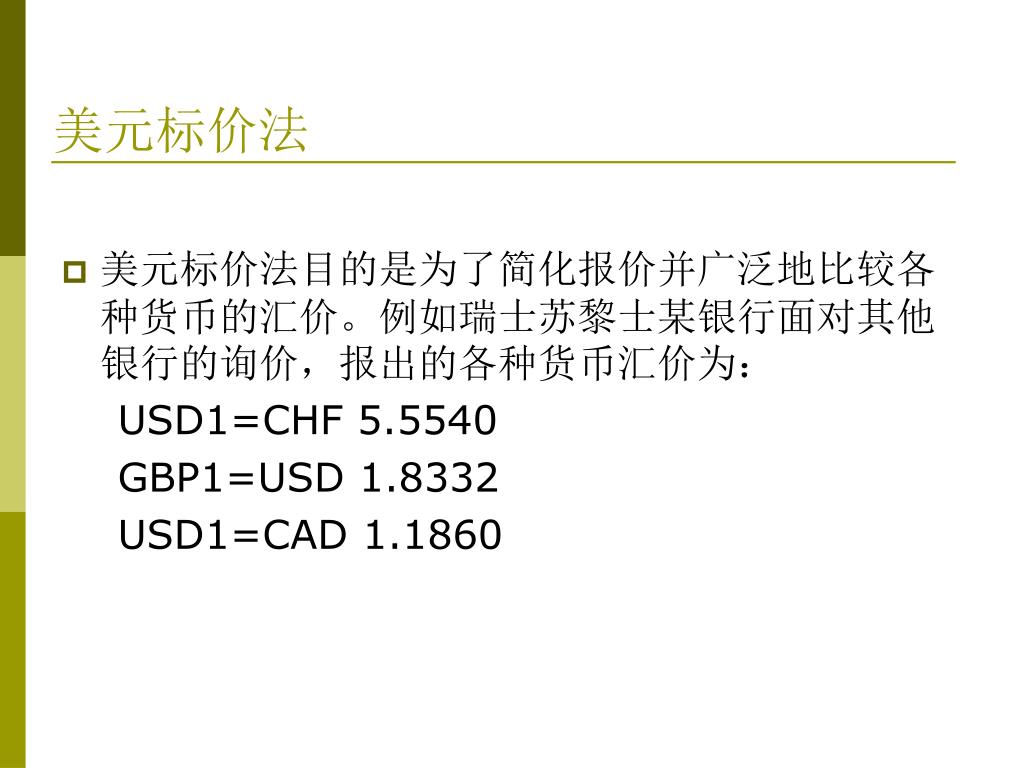 美元标价法 • 美元标价法目的是为了简化报价并广泛地比较各种货币的汇价。例如瑞士苏黎士某银行面对其他银行的询价,报出的各种货币汇价为: USD1=CHF 5.5540 GBP1=USD 1.8332 USD1=CAD 1.1860