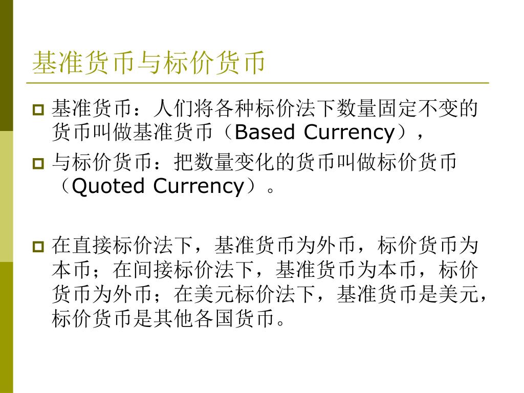 基准货币与标价货币 • 基准货币:人们将各种标价法下数量固定不变的货币叫做基准货币(Based Currency), • 与标价货币:把数量变化的货币叫做标价货币(Quoted Currency)。 • 在直接标价法下,基准货币为外币,标价货币为本币;在间接标价法下,基准货币为本币,标价货币为外币;在美元标价法下,基准货币是美元,标价货币是其他各国货币。