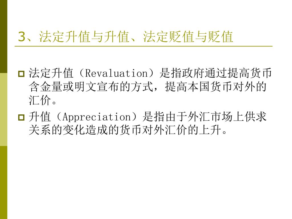 3、法定升值与升值、法定贬值与贬值 • 法定升值(Revaluation)是指政府通过提高货币含金量或明文宣布的方式,提高本国货币对外的汇价。 • 升值(Appreciation)是指由于外汇市场上供求关系的变化造成的货币对外汇价的上升。