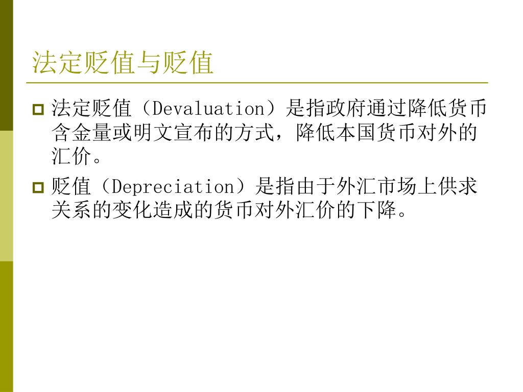 法定贬值与贬值 • 法定贬值(Devaluation)是指政府通过降低货币含金量或明文宣布的方式,降低本国货币对外的汇价。 • 贬值(Depreciation)是指由于外汇市场上供求关系的变化造成的货币对外汇价的下降。
