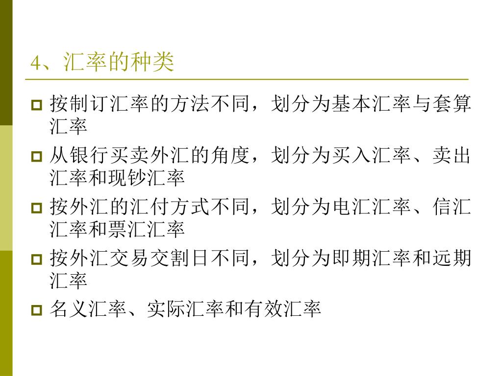 4、汇率的种类 • 按制订汇率的方法不同,划分为基本汇率与套算汇率 • 从银行买卖外汇的角度,划分为买入汇率、卖出汇率和现钞汇率 • 按外汇的汇付方式不同,划分为电汇汇率、信汇汇率和票汇汇率 • 按外汇交易交割日不同,划分为即期汇率和远期汇率 • 名义汇率、实际汇率和有效汇率