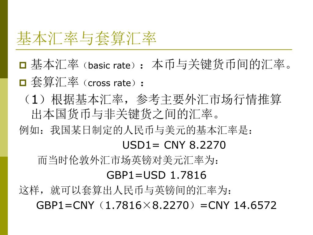 基本汇率与套算汇率 • 基本汇率(basic rate):本币与关键货币间的汇率。 • 套算汇率(cross rate): (1)根据基本汇率,参考主要外汇市场行情推算出本国货币与非关键货之间的汇率。 例如:我国某日制定的人民币与美元的基本汇率是: USD1= CNY 8.2270 而当时伦敦外汇市场英镑对美元汇率为: GBP1=USD 1.7816 这样,就可以套算出人民币与英镑间的汇率为: GBP1=CNY(1.7816×8.2270)=CNY 14.6572