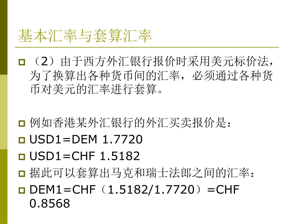 基本汇率与套算汇率 • (2)由于西方外汇银行报价时采用美元标价法,为了换算出各种货币间的汇率,必须通过各种货币对美元的汇率进行套算。 • 例如香港某外汇银行的外汇买卖报价是: • USD1=DEM 1.7720 • USD1=CHF 1.5182 • 据此可以套算出马克和瑞士法郎之间的汇率: • DEM1=CHF(1.5182/1.7720)=CHF 0.8568
