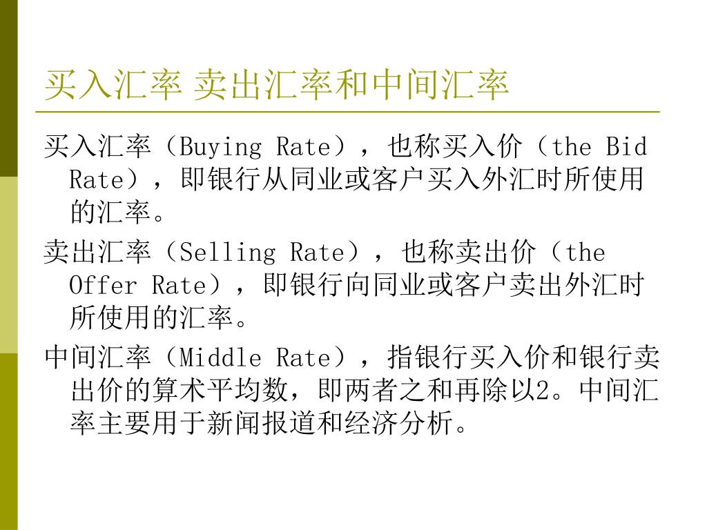 买入汇率 卖出汇率和中间汇率 买入汇率(Buying Rate),也称买入价(the Bid Rate),即银行从同业或客户买入外汇时所使用的汇率。 卖出汇率(Selling Rate),也称卖出价(the Offer Rate),即银行向同业或客户卖出外汇时所使用的汇率。 中间汇率(Middle Rate),指银行买入价和银行卖出价的算术平均数,即两者之和再除以2。中间汇率主要用于新闻报道和经济分析。