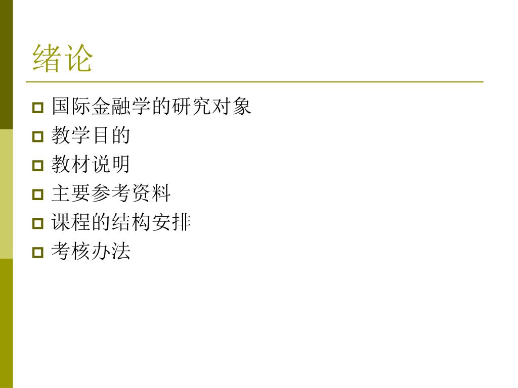 绪论 • 国际金融学的研究对象 • 教学目的 • 教材说明 • 主要参考资料 • 课程的结构安排 • 考核办法