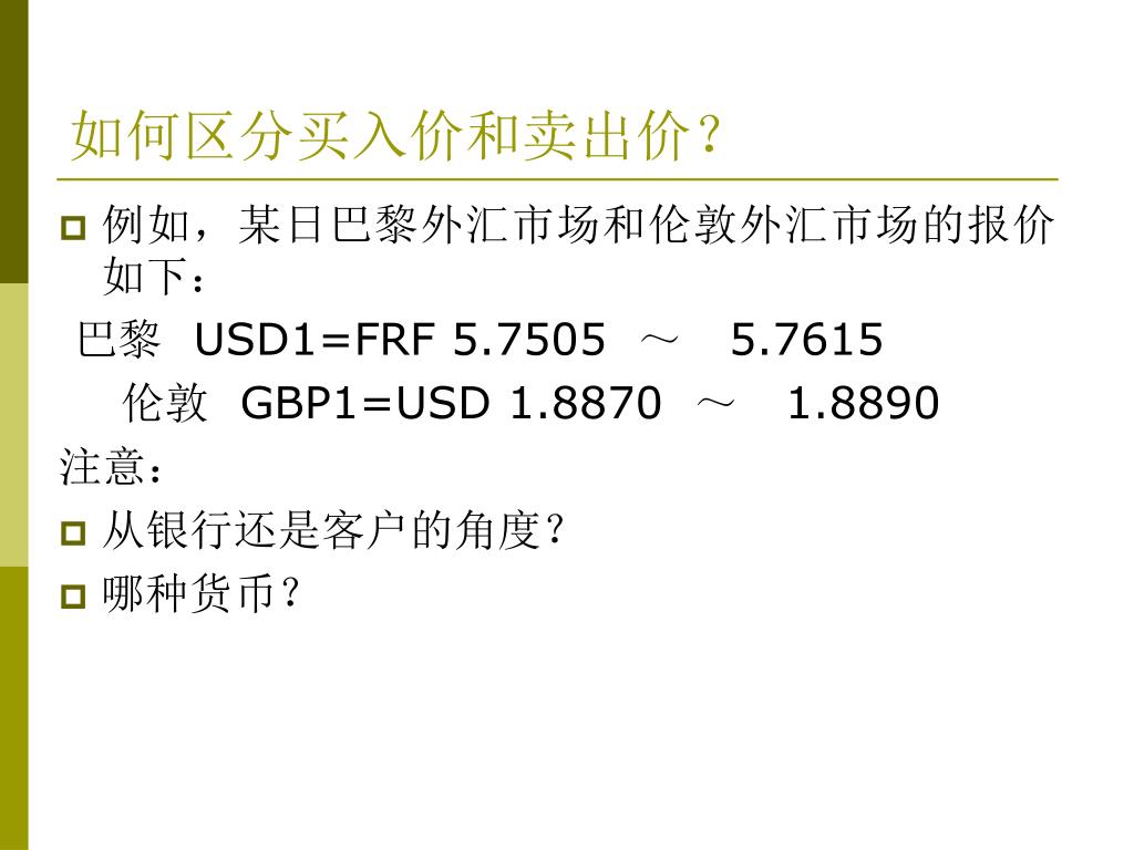 如何区分买入价和卖出价? • 例如,某日巴黎外汇市场和伦敦外汇市场的报价如下: 巴黎 USD1=FRF 5.7505 ~ 5.7615 伦敦 GBP1=USD 1.8870 ~ 1.8890 注意: • 从银行还是客户的角度? • 哪种货币?