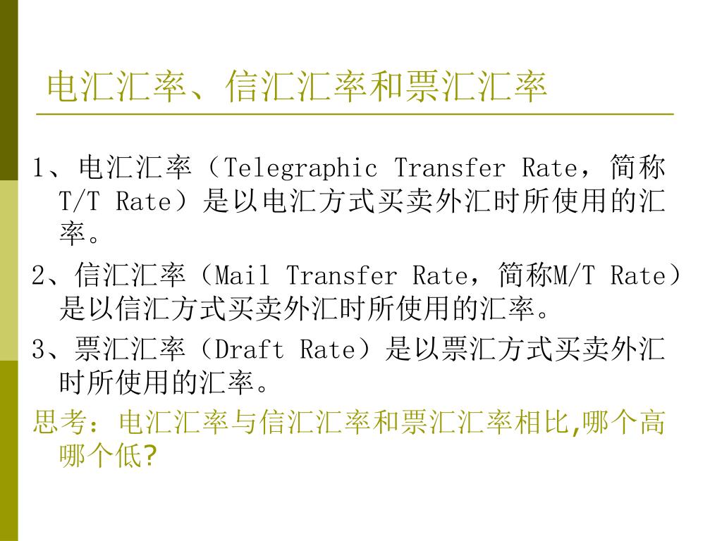 电汇汇率、信汇汇率和票汇汇率 1、电汇汇率(Telegraphic Transfer Rate,简称T/T Rate)是以电汇方式买卖外汇时所使用的汇率。 2、信汇汇率(Mail Transfer Rate,简称M/T Rate)是以信汇方式买卖外汇时所使用的汇率。 3、票汇汇率(Draft Rate)是以票汇方式买卖外汇时所使用的汇率。 思考:电汇汇率与信汇汇率和票汇汇率相比,哪个高哪个低?
