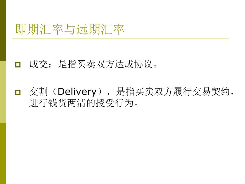 即期汇率与远期汇率 • 成交:是指买卖双方达成协议。 • 交割(Delivery),是指买卖双方履行交易契约,进行钱货两清的授受行为。