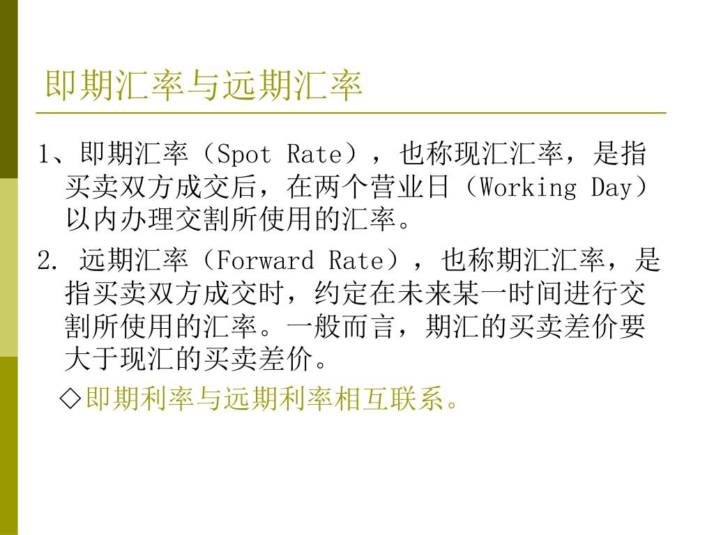 即期汇率与远期汇率 1、即期汇率(Spot Rate),也称现汇汇率,是指买卖双方成交后,在两个营业日(Working Day)以内办理交割所使用的汇率。 2. 远期汇率(Forward Rate),也称期汇汇率,是指买卖双方成交时,约定在未来某一时间进行交割所使用的汇率。一般而言,期汇的买卖差价要大于现汇的买卖差价。 ◇即期利率与远期利率相互联系。