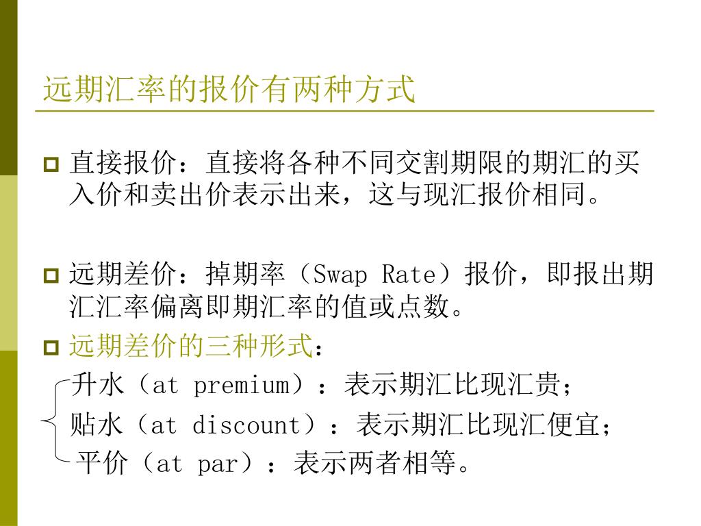 远期汇率的报价有两种方式 • 直接报价:直接将各种不同交割期限的期汇的买入价和卖出价表示出来,这与现汇报价相同。 • 远期差价:掉期率(Swap Rate)报价,即报出期汇汇率偏离即期汇率的值或点数。 • 远期差价的三种形式: 升水(at premium):表示期汇比现汇贵; 贴水(at discount):表示期汇比现汇便宜; 平价(at par):表示两者相等。