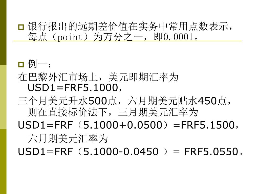 银行报出的远期差价值在实务中常用点数表示,每点(point)为万分之一,即0.0001。银行报出的远期差价值在实务中常用点数表示,每点(point)为万分之一,即0.0001。 • 例一: 在巴黎外汇市场上,美元即期汇率为USD1=FRF5.1000, 三个月美元升水500点,六月期美元贴水450点,则在直接标价法下,三月期美元汇率为 USD1=FRF(5.1000+0.0500)=FRF5.1500, 六月期美元汇率为 USD1=FRF(5.1000-0.0450 )= FRF5.0550。