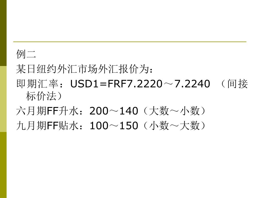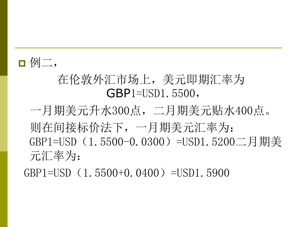例二, 在伦敦外汇市场上,美元即期汇率为 GBP1=USD1.5500, 一月期美元升水300点,二月期美元贴水400点。 则在间接标价法下,一月期美元汇率为:GBP1=USD(1.5500-0.0300)=USD1.5200二月期美元汇率为: GBP1=USD(1.5500+0.0400)=USD1.5900
