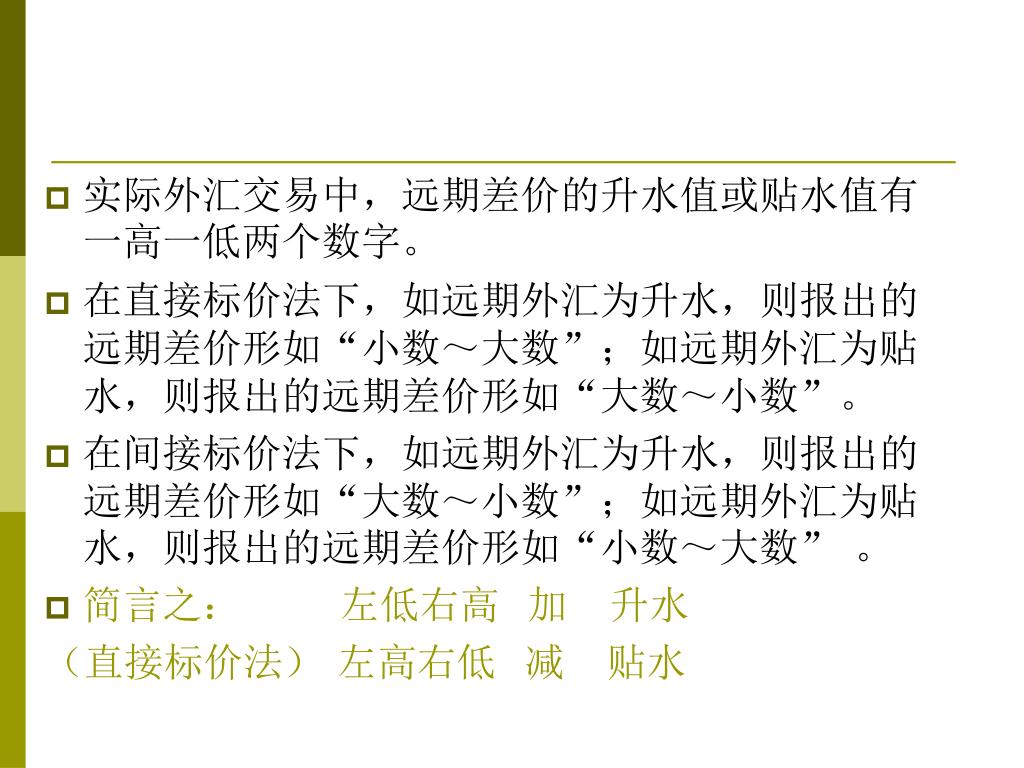 实际外汇交易中,远期差价的升水值或贴水值有一高一低两个数字。实际外汇交易中,远期差价的升水值或贴水值有一高一低两个数字。 • 在直接标价法下,如远期外汇为升水,则报出的远期差价形如“小数~大数”;如远期外汇为贴水,则报出的远期差价形如“大数~小数”。 • 在间接标价法下,如远期外汇为升水,则报出的远期差价形如“大数~小数”;如远期外汇为贴水,则报出的远期差价形如“小数~大数” 。 • 简言之: 左低右高 加 升水 (直接标价法) 左高右低 减 贴水