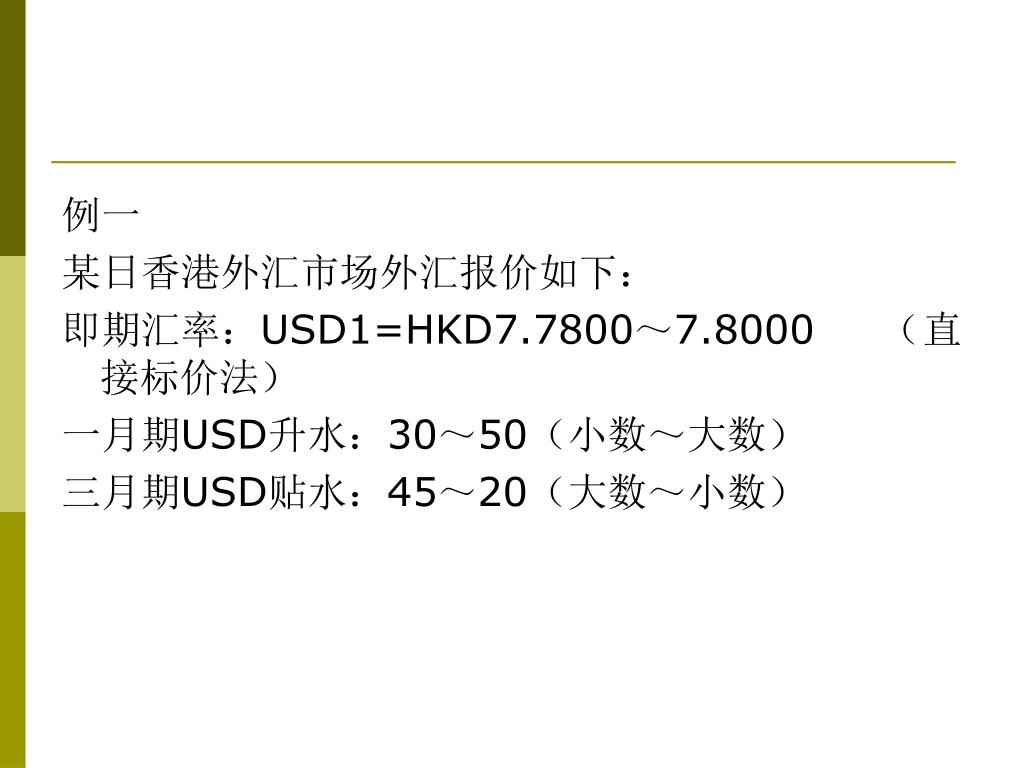 例一 某日香港外汇市场外汇报价如下: 即期汇率:USD1=HKD7.7800~7.8000 (直接标价法) 一月期USD升水:30~50(小数~大数) 三月期USD贴水:45~20(大数~小数)