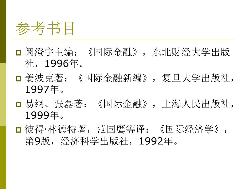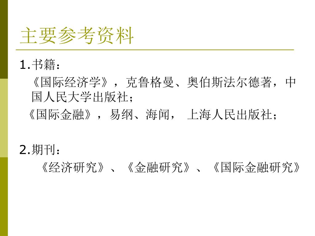 主要参考资料 1.书籍: 《国际经济学》,克鲁格曼、奥伯斯法尔德著,中国人民大学出版社; 《国际金融》,易纲、海闻, 上海人民出版社; 2.期刊: 《经济研究》、《金融研究》、《国际金融研究》