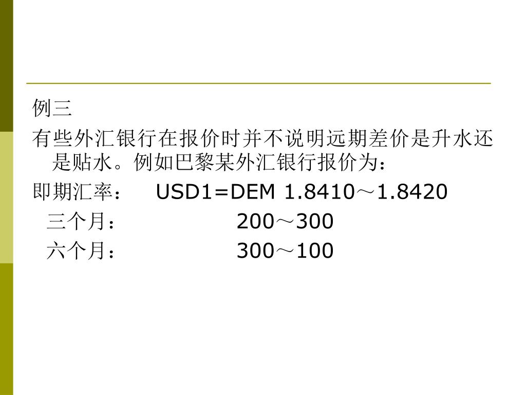 例三 有些外汇银行在报价时并不说明远期差价是升水还是贴水。例如巴黎某外汇银行报价为: 即期汇率: USD1=DEM 1.8410~1.8420 三个月: 200~300 六个月: 300~100