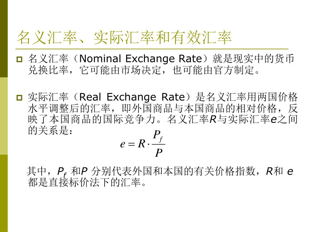 名义汇率、实际汇率和有效汇率 • 名义汇率(Nominal Exchange Rate)就是现实中的货币兑换比率,它可能由市场决定,也可能由官方制定。 • 实际汇率(Real Exchange Rate)是名义汇率用两国价格水平调整后的汇率,即外国商品与本国商品的相对价格,反映了本国商品的国际竞争力。名义汇率R与实际汇率e之间的关系是: 其中,Pf 和P分别代表外国和本国的有关价格指数,R和e都是直接标价法下的汇率。