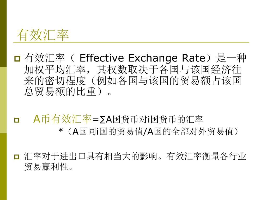 有效汇率 • 有效汇率(Effective Exchange Rate)是一种加权平均汇率,其权数取决于各国与该国经济往来的密切程度(例如各国与该国的贸易额占该国总贸易额的比重)。 • A币有效汇率=∑A国货币对i国货币的汇率 *(A国同i国的贸易值/A国的全部对外贸易值) • 汇率对于进出口具有相当大的影响。有效汇率衡量各行业贸易赢利性。