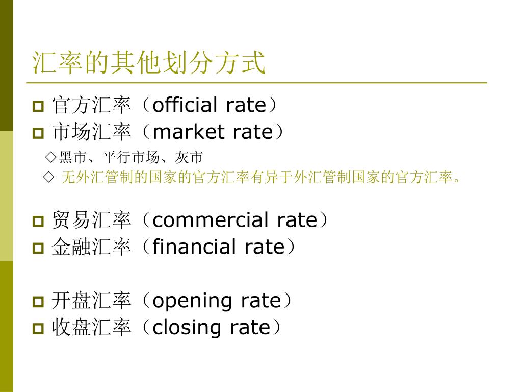 汇率的其他划分方式 • 官方汇率(official rate) • 市场汇率(market rate) ◇黑市、平行市场、灰市 ◇ 无外汇管制的国家的官方汇率有异于外汇管制国家的官方汇率。 • 贸易汇率(commercial rate) • 金融汇率(financial rate) • 开盘汇率(opening rate) • 收盘汇率(closing rate)