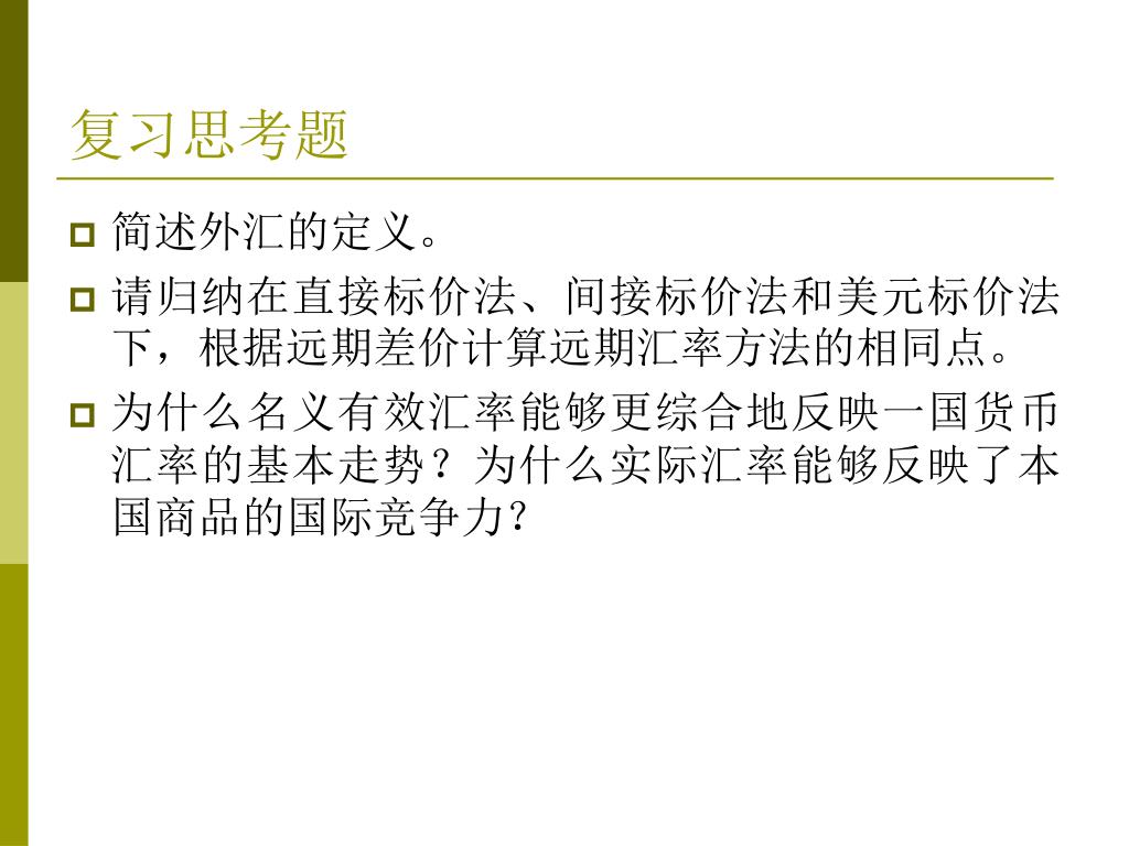 复习思考题 • 简述外汇的定义。 • 请归纳在直接标价法、间接标价法和美元标价法下,根据远期差价计算远期汇率方法的相同点。 • 为什么名义有效汇率能够更综合地反映一国货币汇率的基本走势?为什么实际汇率能够反映了本国商品的国际竞争力?