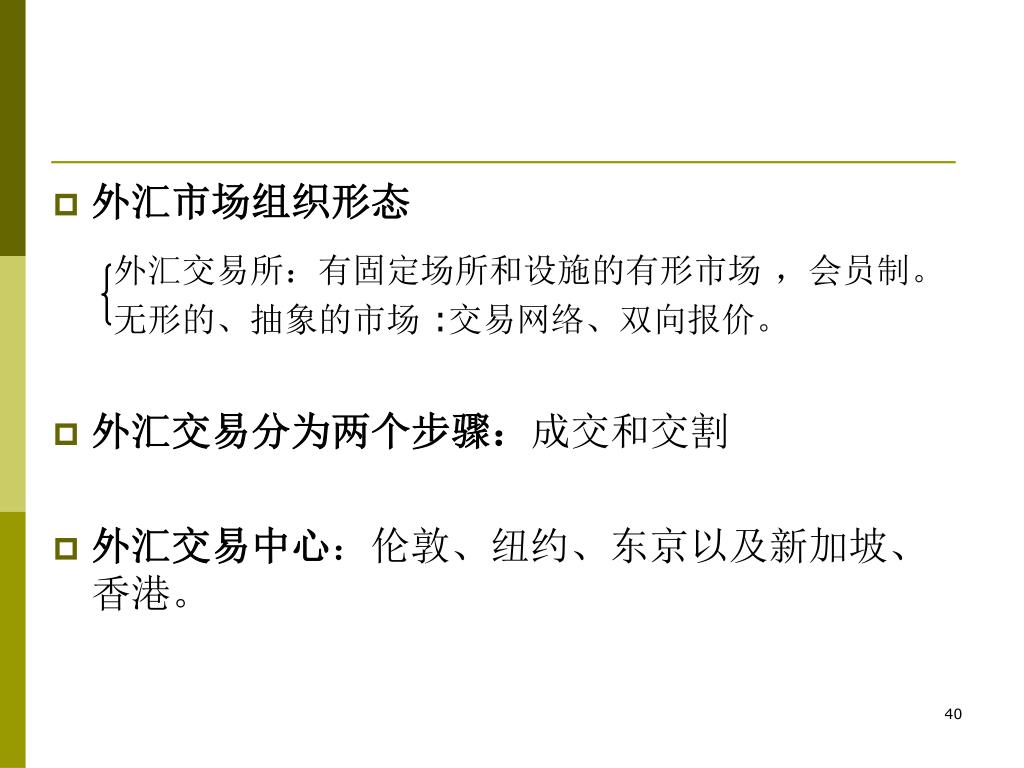 外汇市场组织形态 外汇交易所:有固定场所和设施的有形市场 ,会员制。 无形的、抽象的市场 :交易网络、双向报价。 • 外汇交易分为两个步骤:成交和交割 • 外汇交易中心:伦敦、纽约、东京以及新加坡、 香港。
