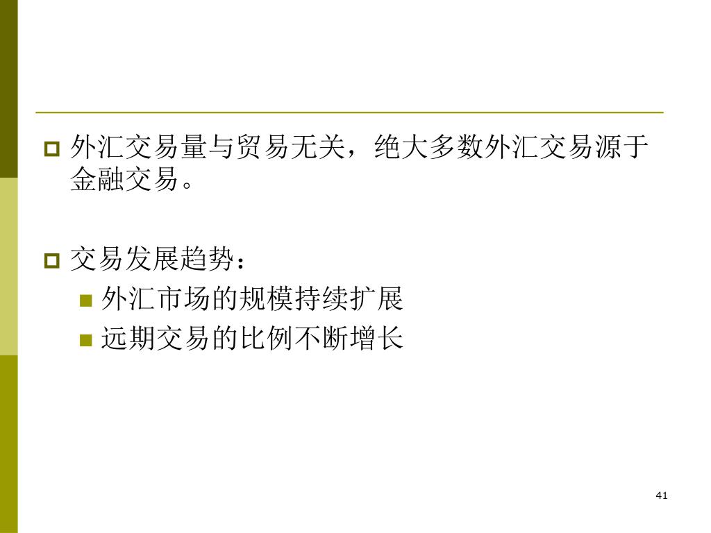 外汇交易量与贸易无关,绝大多数外汇交易源于金融交易。外汇交易量与贸易无关,绝大多数外汇交易源于金融交易。 • 交易发展趋势: • 外汇市场的规模持续扩展 • 远期交易的比例不断增长