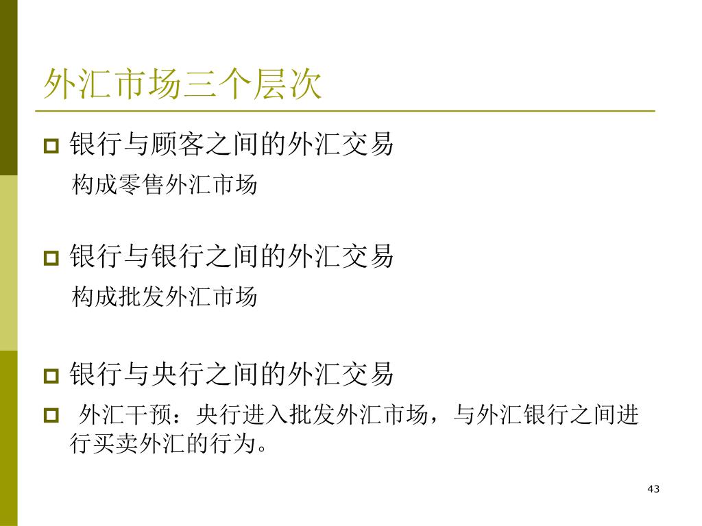 外汇市场三个层次 • 银行与顾客之间的外汇交易 构成零售外汇市场 • 银行与银行之间的外汇交易 构成批发外汇市场 • 银行与央行之间的外汇交易 • 外汇干预:央行进入批发外汇市场,与外汇银行之间进行买卖外汇的行为。
