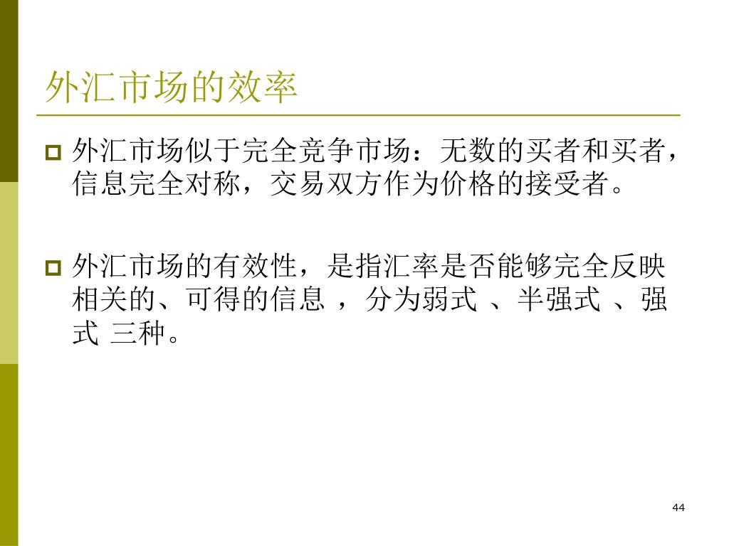 外汇市场的效率 • 外汇市场似于完全竞争市场:无数的买者和买者,信息完全对称,交易双方作为价格的接受者。 • 外汇市场的有效性,是指汇率是否能够完全反映相关的、可得的信息 ,分为弱式 、半强式 、强式 三种。