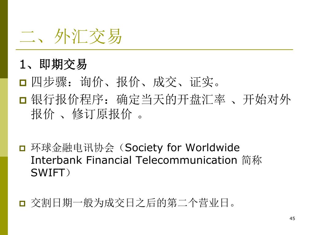 二、外汇交易 1、即期交易 • 四步骤:询价、报价、成交、证实。 • 银行报价程序:确定当天的开盘汇率 、开始对外报价 、修订原报价 。 • 环球金融电讯协会(Society for Worldwide Interbank Financial Telecommunication 简称SWIFT) • 交割日期一般为成交日之后的第二个营业日。