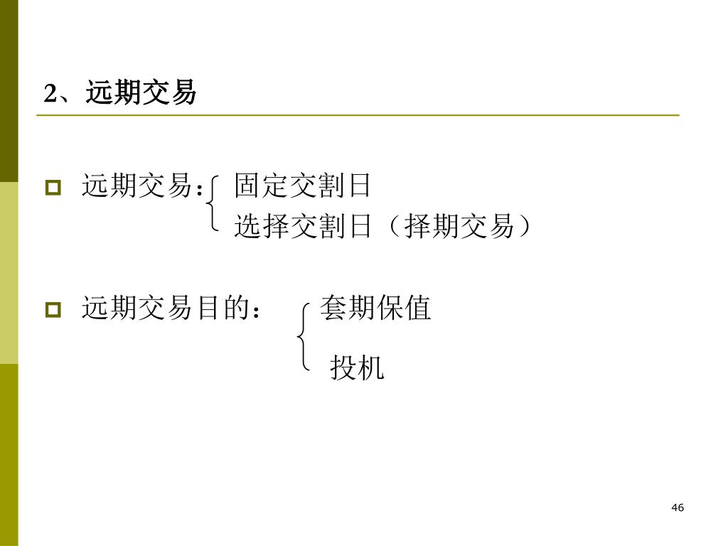 2、远期交易 • 远期交易: 固定交割日 选择交割日(择期交易) • 远期交易目的: 套期保值 投机