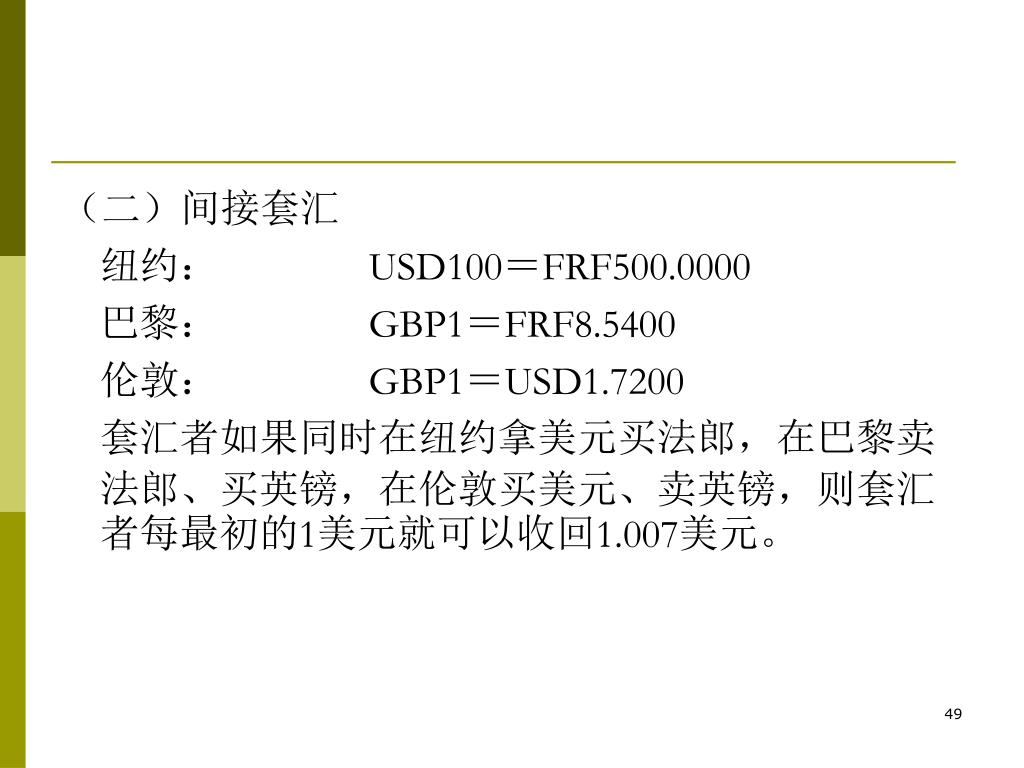(二)间接套汇 纽约: USD100=FRF500.0000 巴黎: GBP1=FRF8.5400 伦敦: GBP1=USD1.7200 套汇者如果同时在纽约拿美元买法郎,在巴黎卖法郎、买英镑,在伦敦买美元、卖英镑,则套汇者每最初的1美元就可以收回1.007美元。