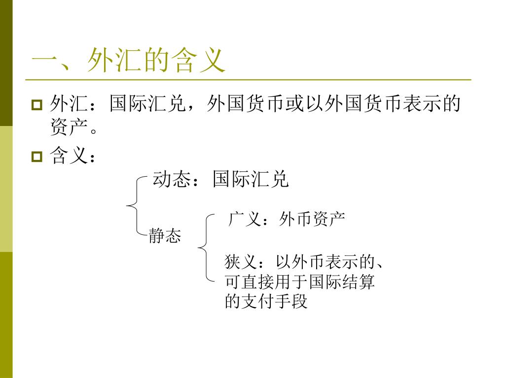 一、外汇的含义 • 外汇:国际汇兑,外国货币或以外国货币表示的 资产。 • 含义: 动态:国际汇兑 广义:外币资产 静态 狭义:以外币表示的、可直接用于国际结算的支付手段