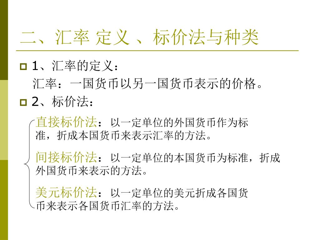 二、汇率 定义 、标价法与种类 • 1、汇率的定义: 汇率:一国货币以另一国货币表示的价格。 • 2、标价法: 直接标价法:以一定单位的外国货币作为标 准,折成本国货币来表示汇率的方法。 间接标价法:以一定单位的本国货币为标准,折成外国货币来表示的方法。 美元标价法:以一定单位的美元折成各国货 币来表示各国货币汇率的方法。