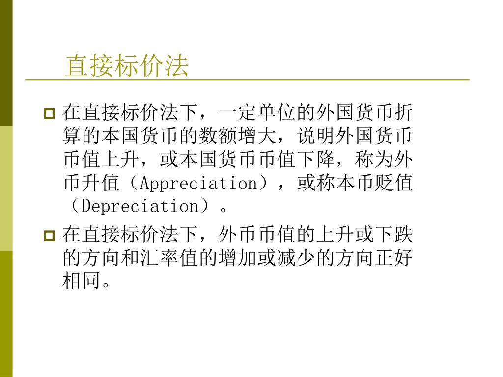 直接标价法 • 在直接标价法下,一定单位的外国货币折算的本国货币的数额增大,说明外国货币币值上升,或本国货币币值下降,称为外币升值(Appreciation),或称本币贬值(Depreciation)。 • 在直接标价法下,外币币值的上升或下跌的方向和汇率值的增加或减少的方向正好相同。